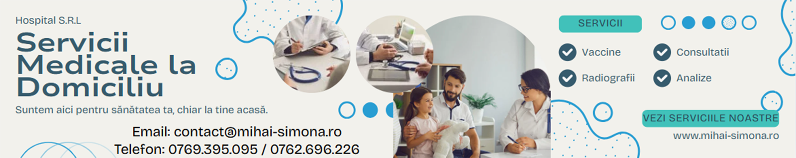 Suntem aici pentru sănătatea ta, chiar la tine acasă. Oferim servicii medicale la domiciliu, rapide, sigure și personalizate, pentru ca tu să primești îngrijirea de care ai nevoie, în confortul propriului cămin. Echipa noastră de profesioniști este gata să te ajute, ori de câte ori ai nevoie.